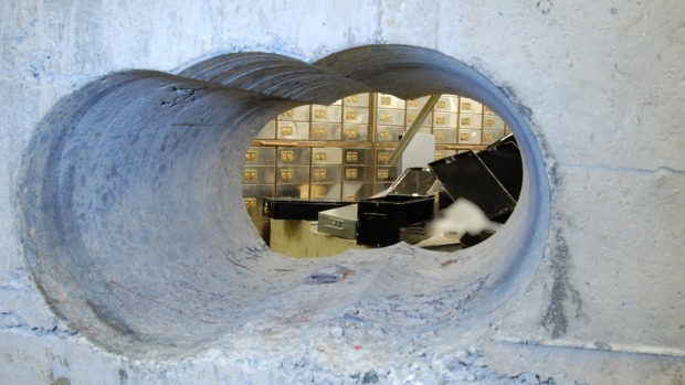 Pictures show how the thieves drilled through a metre-and-a-half thick wall to get to the jewels. Source: Hatton Garden jewel